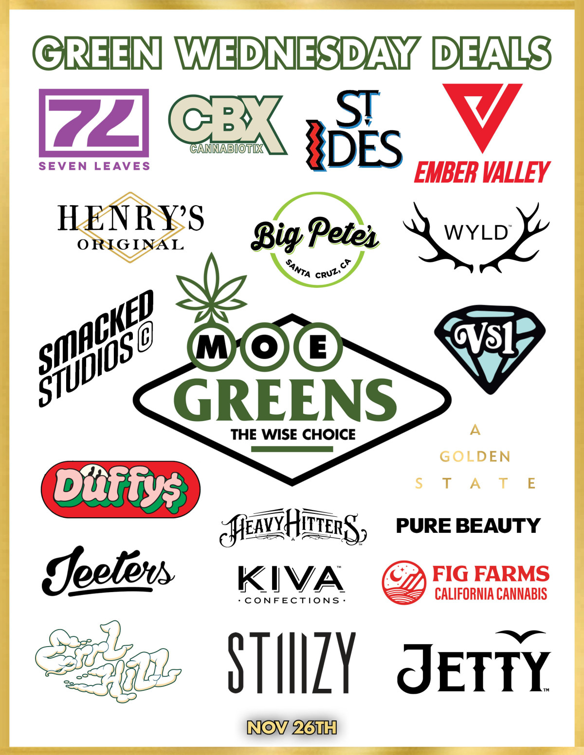 In summary, the Green Wednesday celebration at Moe Greens on November 26th is an event that promises to offer incredible deals on a wide variety of cannabis products. With discounts on popular brands such as STIIIZY, Seven Leaves, Cannabiotix, and many others, customers will have the chance to stock up on their favorites while enjoying a festive atmosphere. Moe Greens invites everyone to join in the celebration and experience the best that the cannabis community has to offer. Whether you are a seasoned user or new to cannabis, this event is sure to provide something for everyone.